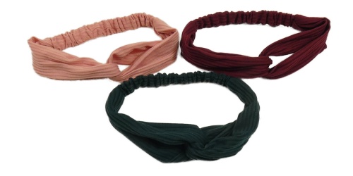 3x žebrovaná látková čelenka s uzlem - růžová + vínová + tmavozelená