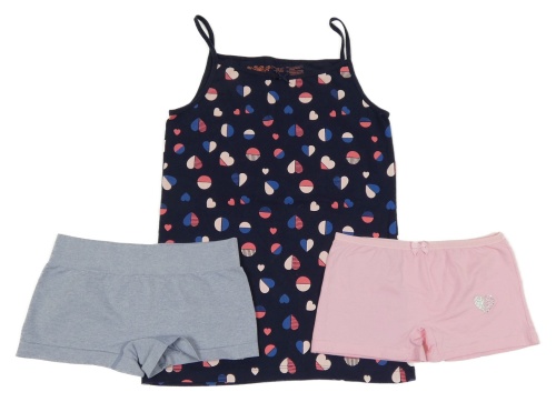 • 3set - Tmavomodrá košila se puntíky a srdíčky + růžové kalhotly se srdcem s kamínky + modré melírované
