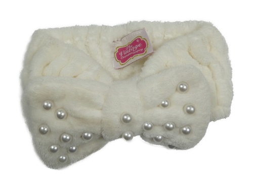 Smetanová plyšová kosmetická čelenka s mašlí s perlami