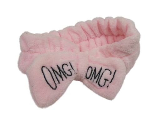Růžová plyšová kosmetická čelenka s mašlí a nápisy