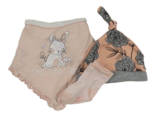 • 3set - Růžovo-šedá květovaná čepice + růžovo-bílé pruhované ponožky + světlerůžový slinták s králíčkem a volánky
