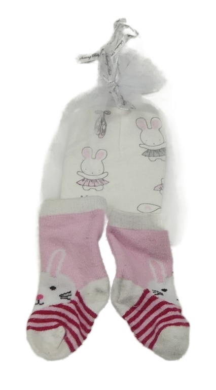 • Nové - 2set - bílá čepička s králíčky + bílo-růžové pruhované ponožky s králíčky