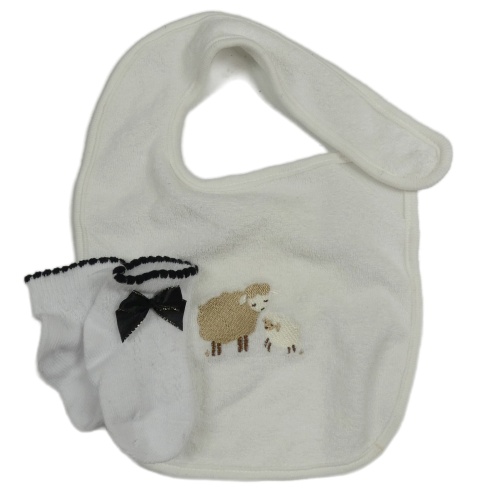 Nové - 2set - Bílý froté bryndák s ovečkami + bílo-černé ponožky s mašlí