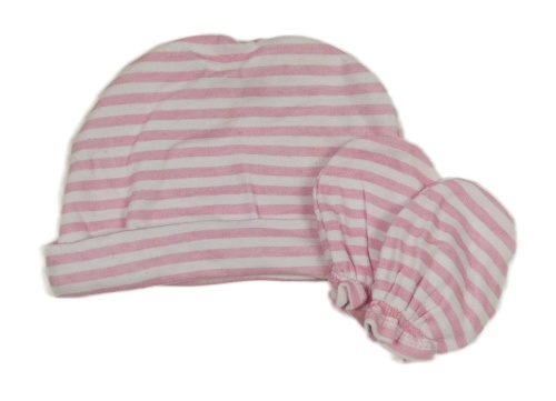 2 set - bílo-růžová pruhovaná bavlněná čepice + rukavice