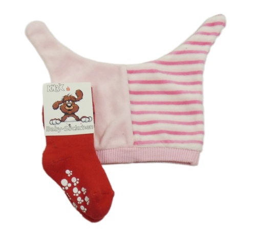 2 set - růžová sametová čepice s pruhy + červené ponožky s protiskluzem