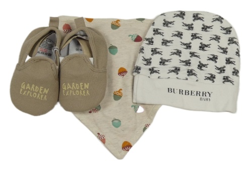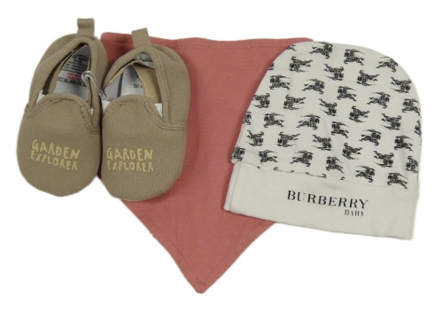 3 set - béžové capáčky s nápisem + bílá čepice - Burrberry + oboustranný slinták