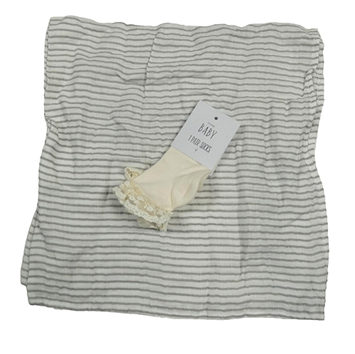 • 2set - Světlebéžové ponožky s krajkou + bílo-šedá pruhovaná mušelínová plena