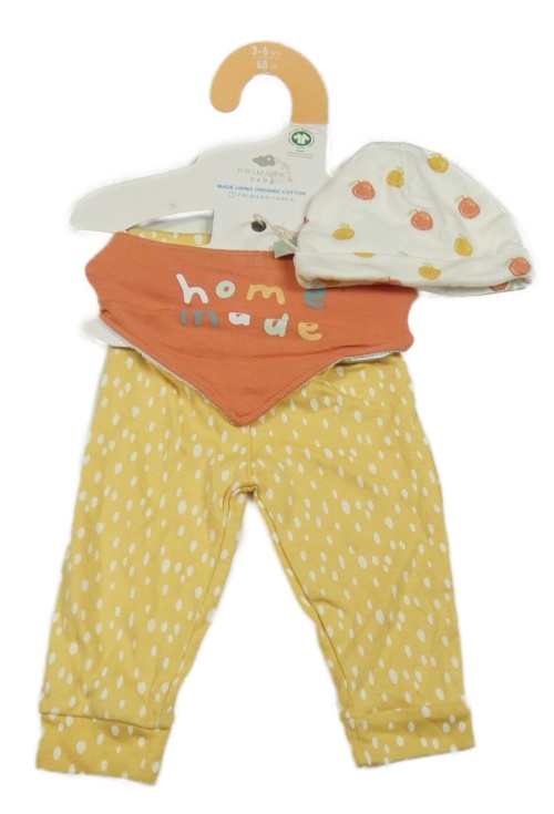 • Nové - 3set - Broskvový slinták + hořčicové puntíkaté tepláky + čepice s ovocem Primark