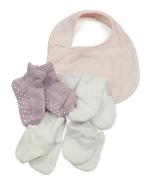 Nové - 5 set - světlerůžový bryndák + lila ponožky + 3x bílé rukavice