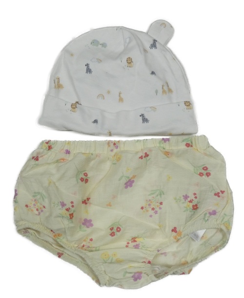 2 set - bílá čepice se zvířátky + žluté kalhotky pod šaty s květy