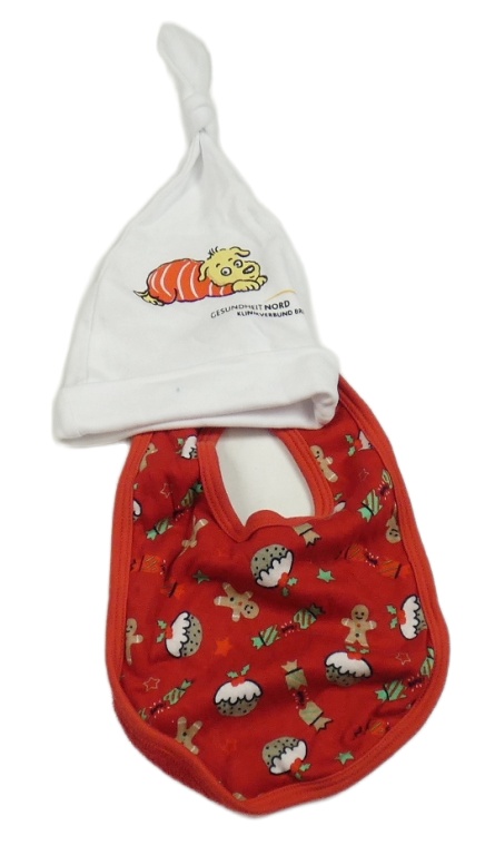 • 2set - Bílá čepice s pejskem + červený bryndák s vánočními obrázky