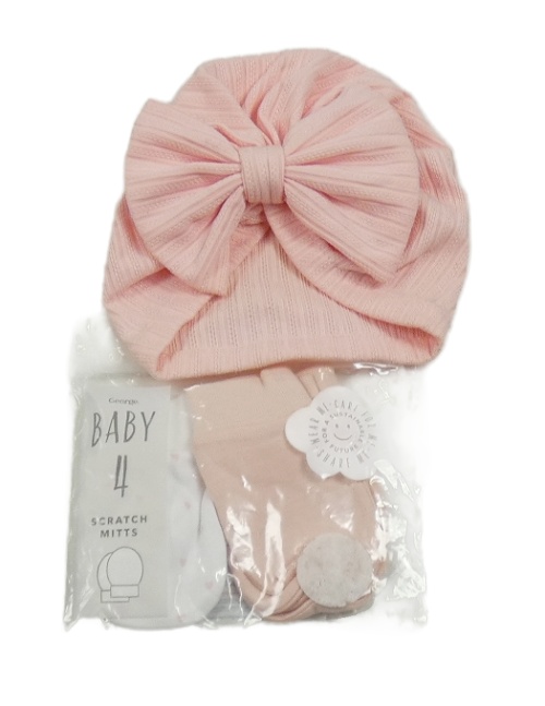 4set - 1x Růžová turbanová čepice s mašlí + 2x růžové rukavice + 1x bílé se srdíčky