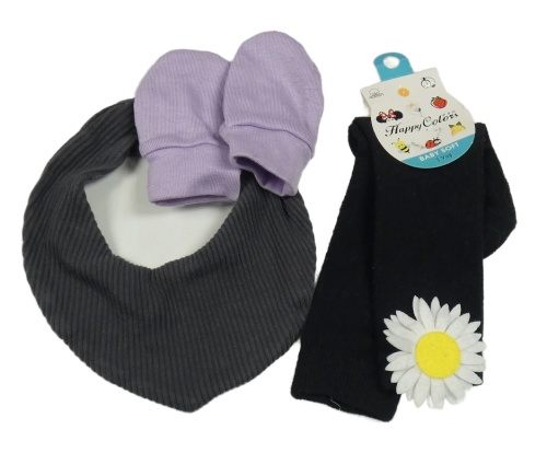 • Nové - 3Set - Černé žebrované nadkolenky s 3D kopretinou + tmavošedý žebrovaný šátek H&M + levandulové rukavice