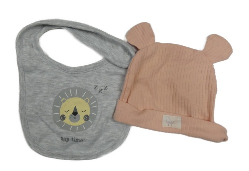 • 2set - Světlerůžová žebrovaná čepice s oušky + šedý bryndák s lvíčkem