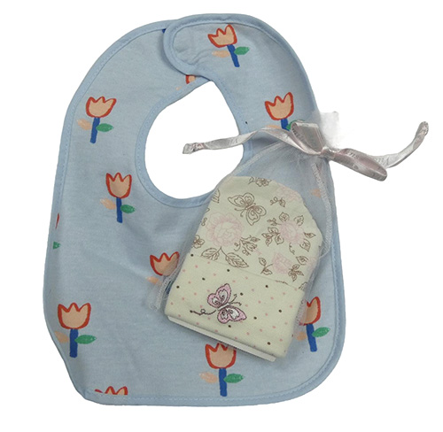• 2set - Světlemodrý květovaný bryndák + krémová květovaná bavlněná čepice s motýly a puntíky