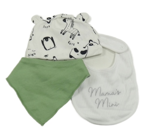 3set - Bílá čepice se zvířátky + bílý bryndák + zelený slinták
