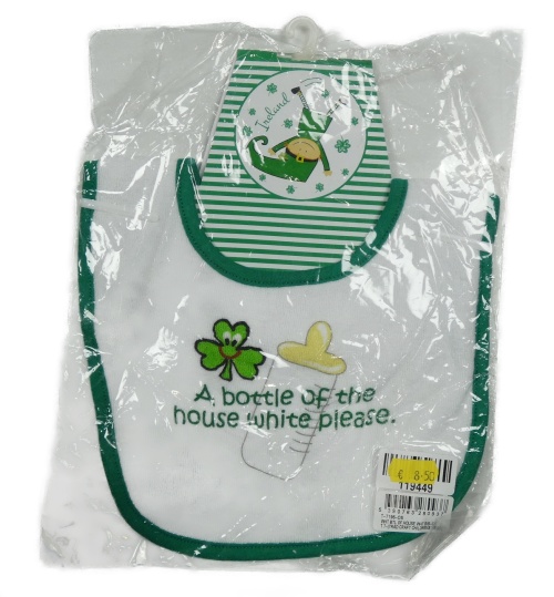 • Nové - bílo-tmavozelený froté bryndák s nápisy a lahvičkou a trojlístkem