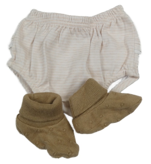 Nové - Broskvovo-bílé pruhované kraťasy + béžové pletené capáčky