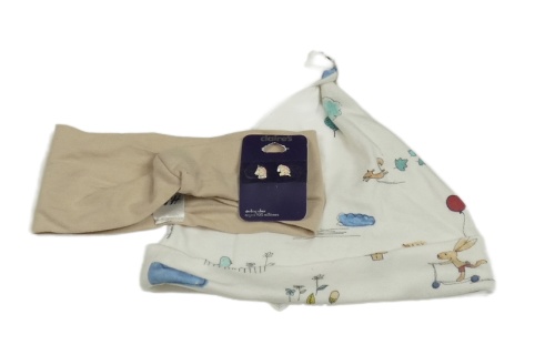 Nové - 3set - Bílá čepice s obrázky + béžová čelenka + náušnice jednorožec