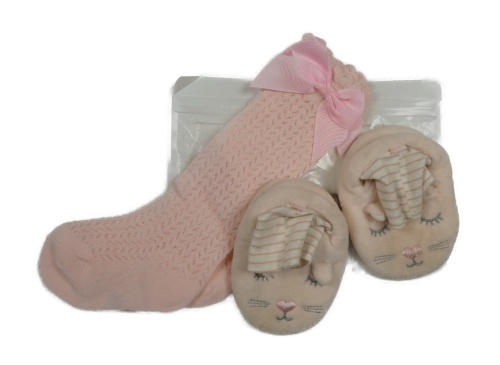 2set - Růžové perforované podkolenky s mašlí + chlupaté capáčky s čumákem vel. 17