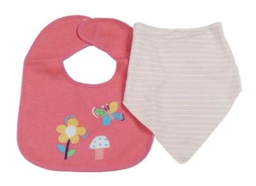• 2set - Růžový bryndák s květem a motýlem + světlerůžovo-bílý pruhovaný slinták