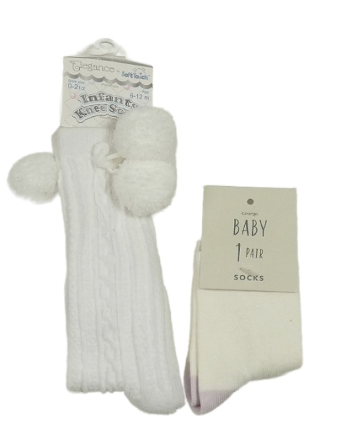 Nové - 2x - Ponožky - Bílé žebrované vzorované s bambulemi Soft Touch, smetanovo/světlefialové George