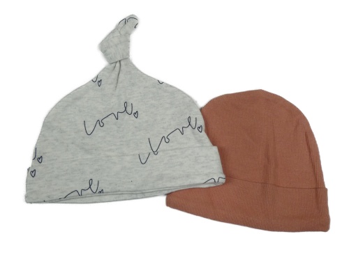 2 x čepice - šedá melírovaná s nápisy + hnědorůžová žebrovaná