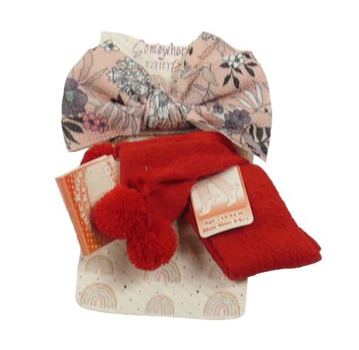• 2set - Růžová květovaná šelenka s mašlí + červené podkolenky s bambulemi