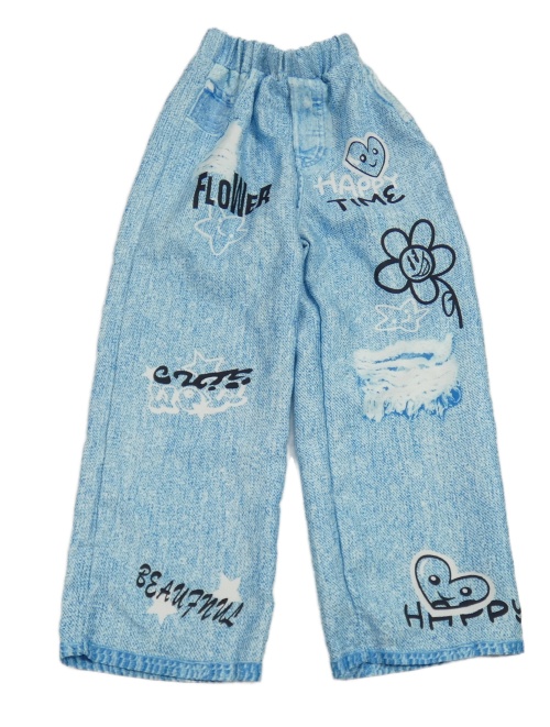 Modro-bílé wide leg kalhoty riflového vzhledu s nápisy a srdíčky a květem
