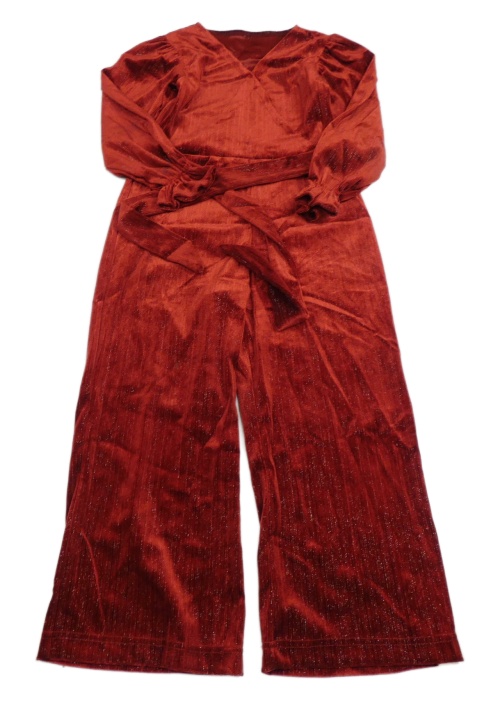 • Červený pruhovaný sametový kalhotový overal se třpytkami a zavazováním