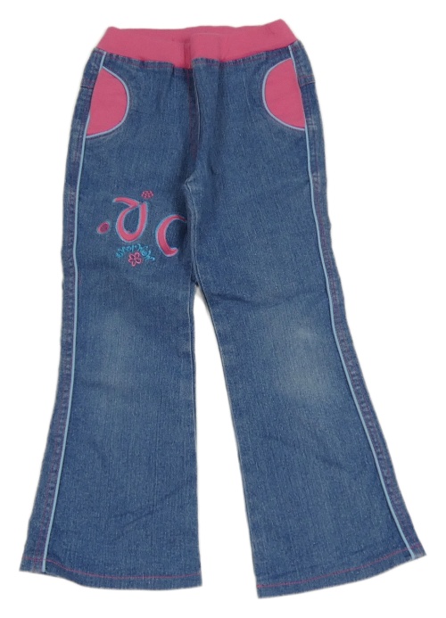 Modré flare rifle s výšivkou a růžovým úpletovým pasem