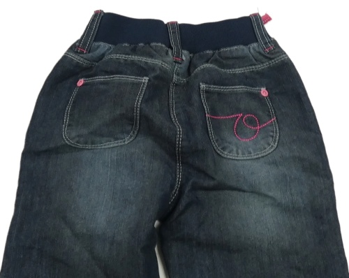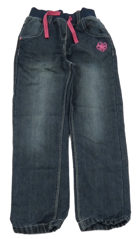 Tmavomodré lehké rifle s úpletovým pasem a výšivkou květu orchestra