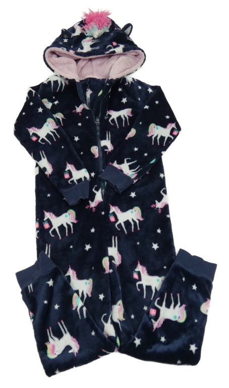 Tmavomodrá chlupatá kombinéza s jednorožci a kapucí