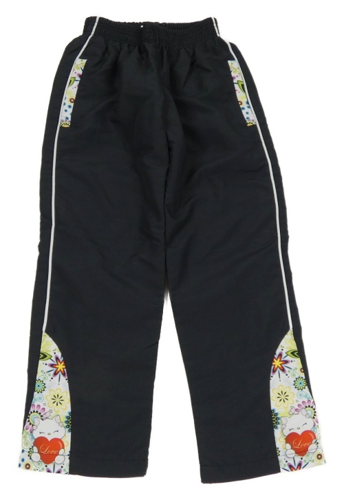 • Černo-bílé šusťákové podšité kalhoty s kočičkami a kytičkami Ana Coli