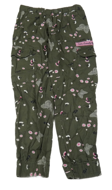 Tmavozelené květované plátěné kalhoty s motýly a kapsami