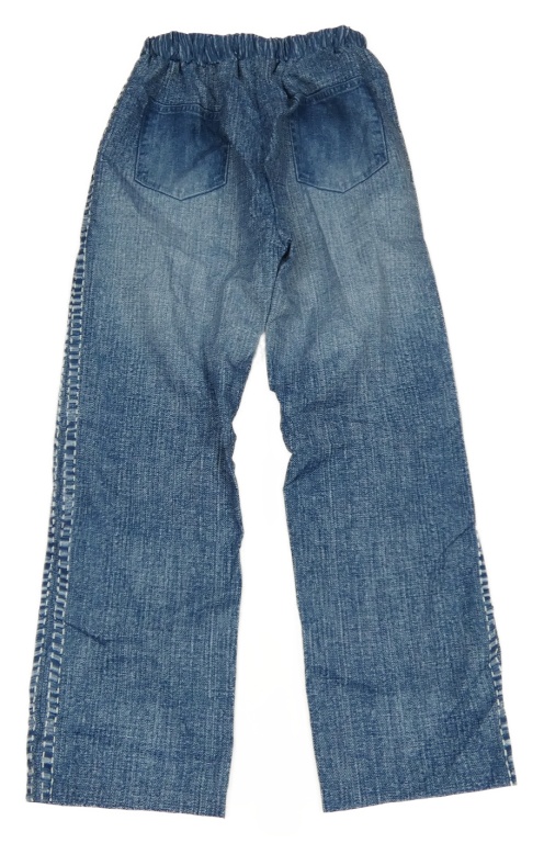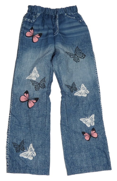 Modré šusťákové kalhoty riflového vzhledu s motýlky
