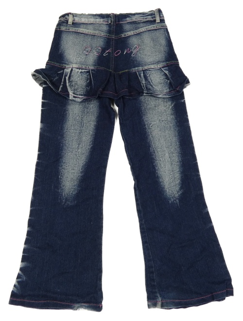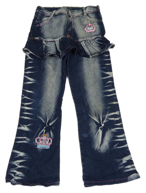 Tmavomodré vzorované flare rifle s našitou sukní a výšivkami