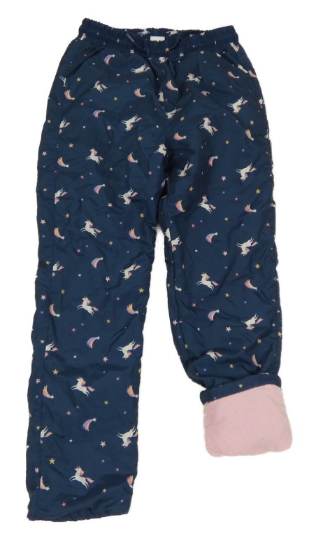 Tmavomodré šusťákové zateplené kalhoty s jednorožci