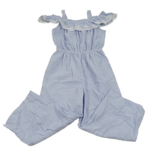 • Světlemodro-bílý pruhovaný kalhotový overal s volánkem s madeirou Primark