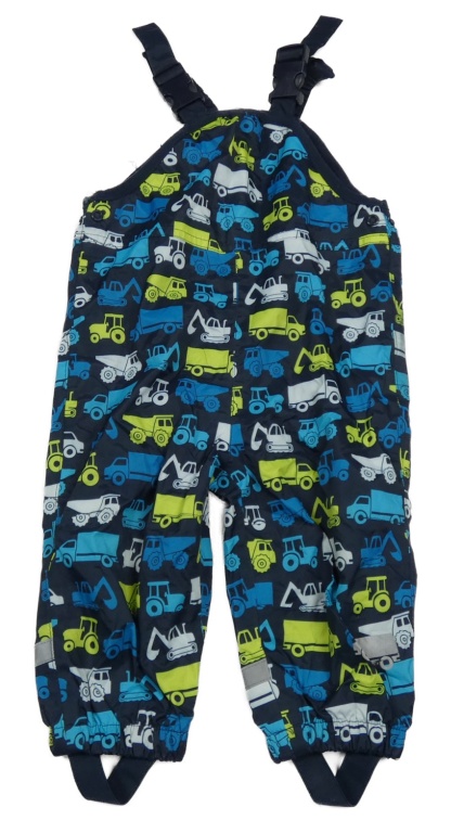 Tmavomodré šusťákové laclové podšivé kalhoty s auty Topolino