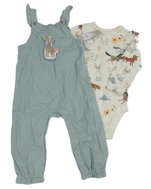 • Nové - 2set - Světlelmodré manšestrové laclové kalhoty s králíkem + smetanové body se zvířaty M&S