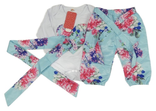 • Nové - 3Set - Světlemodré cuff saténové kalhoty s kytičkami a zavazováním + zavazovací šátek + bílé body se srdíčky