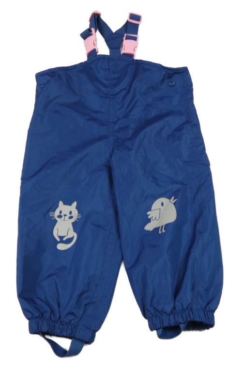 • Tmavomodré šusťákové podšité laclové kalhoty s kočkou a ptáčkem Pocopiano
