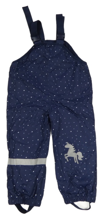 • Tmavomodré šusťákové nepromokavé laclové podšité kalhoty s jednorožcem a srdíčky Topolino