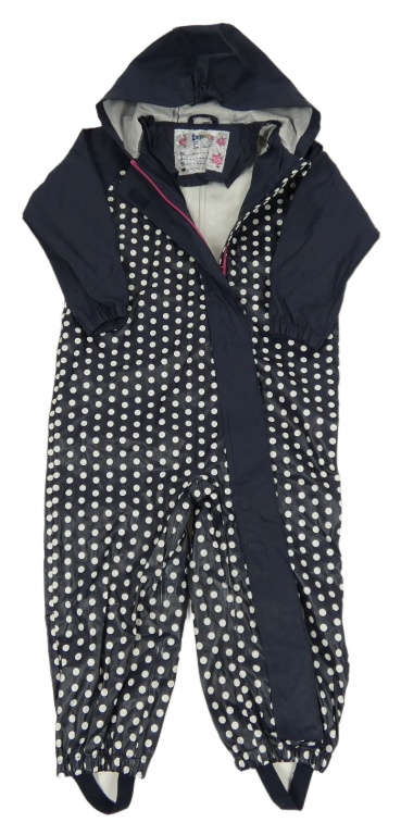 Tmavomodrá nepromokavá kombinéza s puntíky a kapucí lupilu