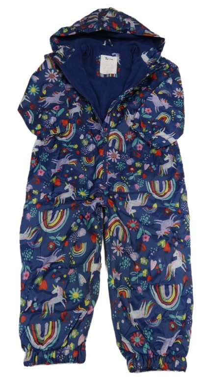 Tmavomodrá květovaná šusťáková podzimní kombinéza s jednorožci a kapucí Tu