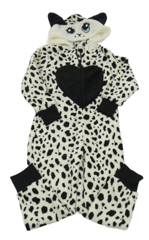 Bílo-černá vzorovaná plyšová kombinéza s kapucí - kočka