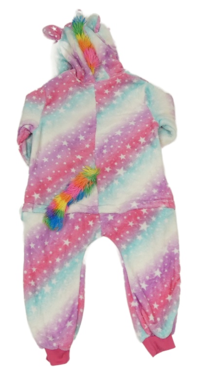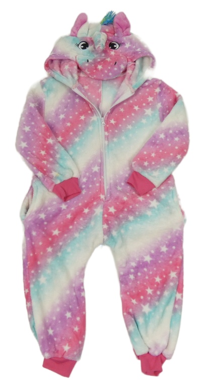 Růžovo-barevná pruhovaná kožešinová kombinéza s kapucí - jednorožec