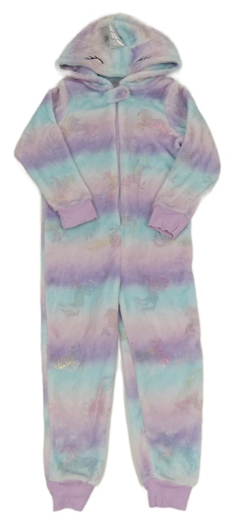 Světlemodro-růžovo-lila chlupatá kombinéza s jednorožci a kapucí Matalan