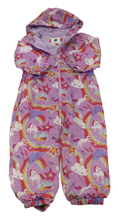 Fialová šusťáková podzimní kombinéza s jednorožci a duhami a kapucí Tu